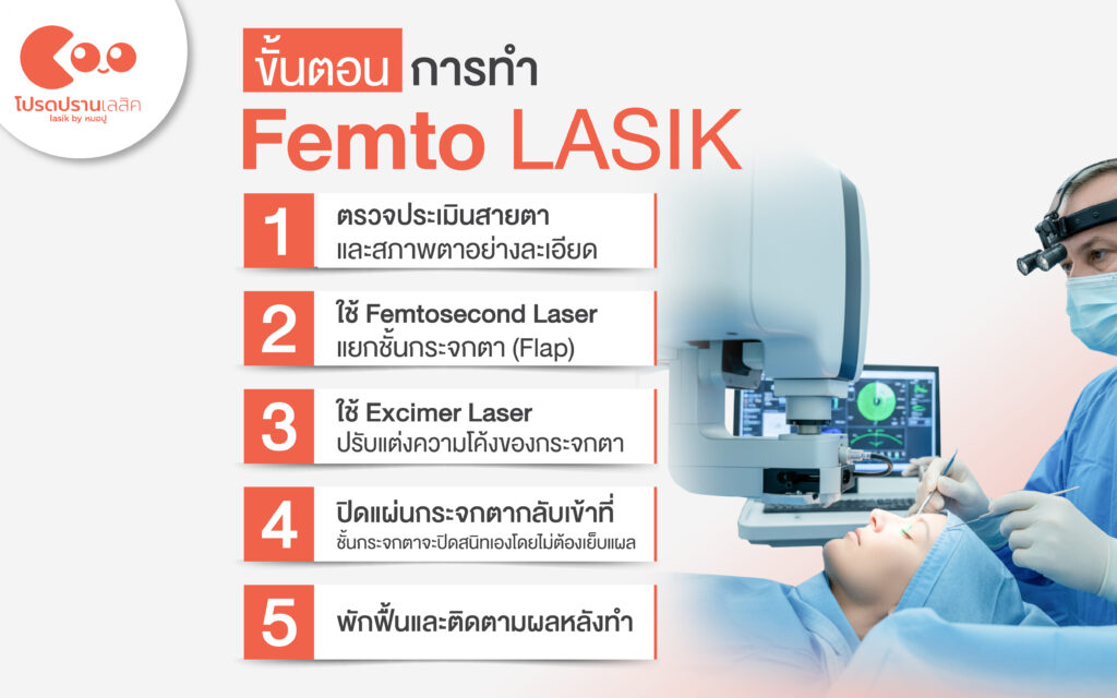 กล่าวง่าย ๆ คือ Femto LASIK คือการใช้เลเซอร์ที่มีความละเอียดสูงระดับไมครอนในการแยกชั้นกระจกตาอย่างแม่นยำก่อนปรับแต่งค่าสายตาด้วย Excimer Laser เพื่อให้กระจกตาโค้งเหมาะสมกับการมองเห็น